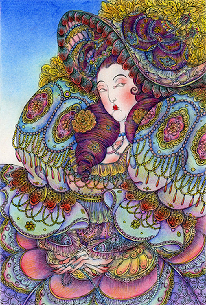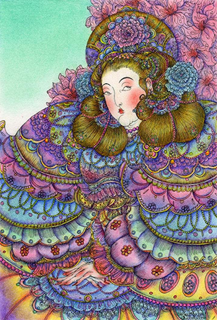 Description: Woman 2 and Woman 1 (see above), these two portraits, whether it is her moving facial expression and exquisite hairstyle, or her noble and gorgeous clothing, the artist successfully lets the viewer feel the transformation and fusion of Eastern and Western aesthetic and cultural elements. (CLICK ON THE IMAGE TO ENLARGE IT.)
